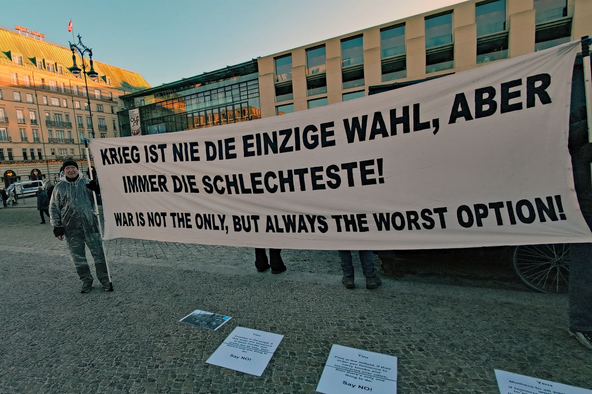 Jeden Sonntag findet von 14 bis 16 Uhr am Brandenburger Tor auf dem Pariser Platz ein Flashmob für den Frieden statt. "KRIEG IST NIE DIE EINZIGE WAHL,